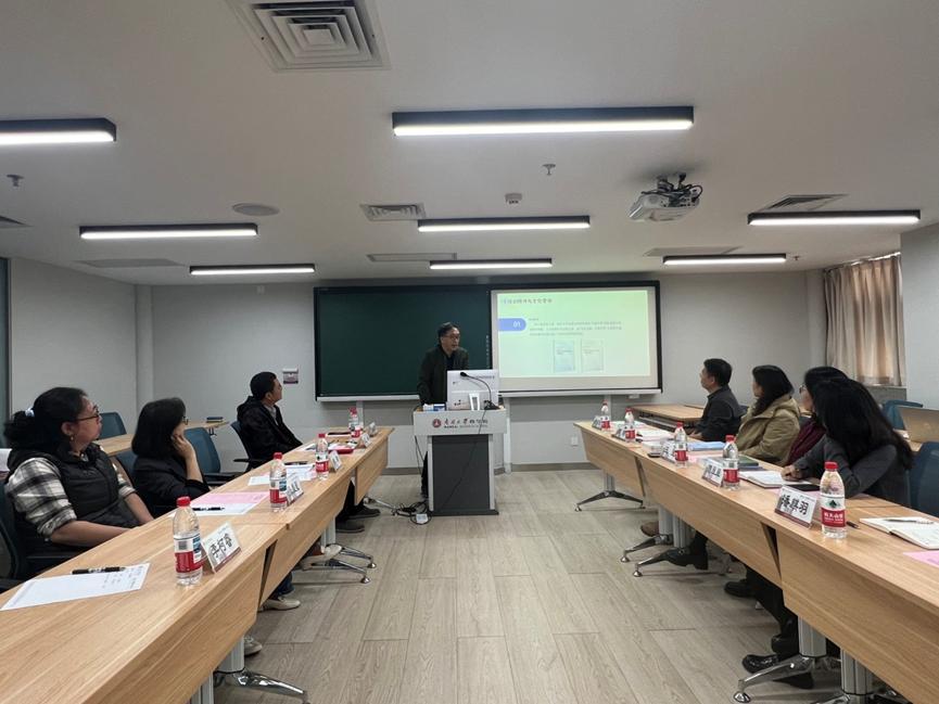 出版社第三编辑室主任王冰介绍了出版社在教材与学术专著出版等方面的优秀成果,并结合与商学院的合作经验,介绍了出版社的业务流程和支持政策。营销部主任王政洋从教材发行角度进行政策与业务分享,明确出版社“以教材为核心”的战略定位,详细介绍精品教材的市场表现与反馈。与会教师针对出版流程、出版周期、数字出版方式和国家社科基金后期资助项目申报等具体问题进行了深入的交流,出版社相关负责人逐一说明各环节的工作安排与支持政策,解答了老师们在教材编写与出版过程中的困惑。