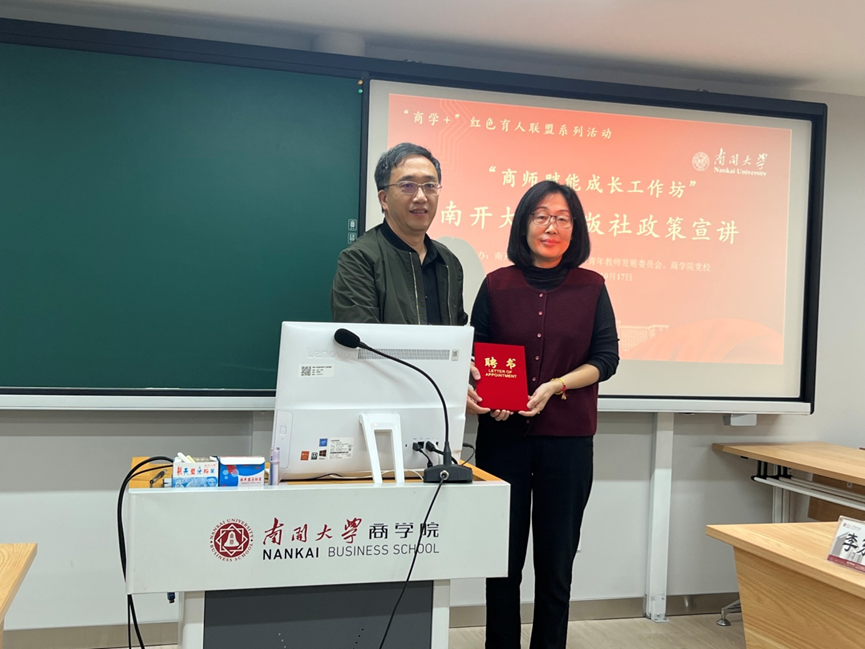 商学院党委书记王坚表示,此次活动在出版社和学院教师之间搭建了一个便捷的出版咨询平台,有助于教师更好地开展学术著作和教材的出版工作。双方均表示,将进一步加强合作,共同推动南开大学商学院高水平学术成果的出版与传播。活动开场时,王坚为出版社第三编辑室主任王冰致聘“商学院青年教工成长导师”,进一步强化双方共建机制、完善教师发展支持体系。