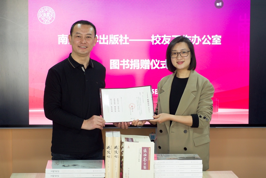 座谈结束后,双方共同举行图书捐赠仪式。韩玲书记代表南开大学出版社向校友工作办公室捐赠了《张伯苓全集》《迦陵词》《文明对话》《十二珍品阁》等精品图书。王巍主任对南开大学出版社的慷慨捐赠表示感谢,并颁发捐赠证书,双方合影留念。